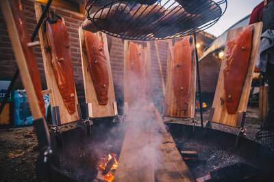 Tijdens deze workshop leer je hoe je zalm kan roken op de Finse manier, namelijk op de plank bij het kampvuur. Deze manier heet in het Fins: Loimulohi. We gaan je leren hoe je zalm kan opspijkeren op een plank met houten nagels, en vervolgens leer je hoe je het beste zalm kan roken. Welke toepassingen zijn nodig en hoe kan je extra smaak geven aan je zalm. Wij kiezen tijdens deze workshop voor zalm die wild gevangen is in Alaska.