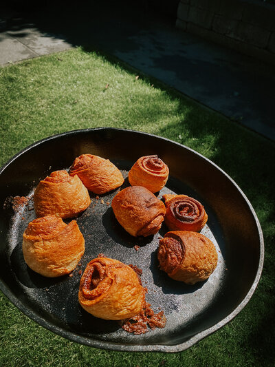 Tijdens deze workshop leer je hoe je traditionele Zweedse Kanelbullar bakt in een Dutch oven boven het kampvuur. Je kneedt het deeg, vult het met kaneel, suiker en boter en ontdekt hoe je de oven optimaal gebruikt voor luchtige, goudbruine broodjes. We werken met pure ingrediënten en laten zien hoe je extra smaak kunt toevoegen, zoals kardemom. Na afloop geniet je van je eigen warme kaneelbroodjes met een kop kampvuurkoffie.